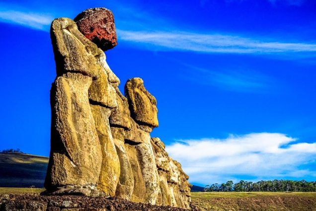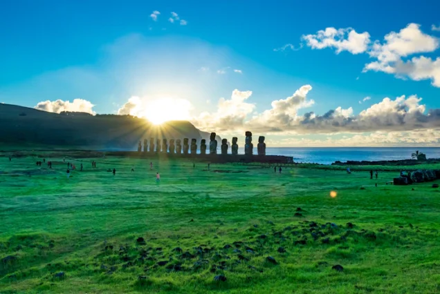 🏝️Visitarás el majestuoso Ahu Tongariki, la plataforma ceremonial más grande de la Polinesia, donde 15 imponentes moai se alzan alineados frente al océano Pacífico.